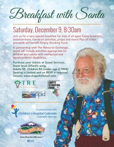 Join us for a very special breakfast for kids of all ages! Enjoy breakfast, entertainment, hands-on activities, prizes and more! Plus all ticket proceeds will benefit the Empty Stocking Fund. In partnership with Chapel Hills Mall, event will include activities appropriate for children and adults with intellectual and developmental disabilities. You can purchase your tickets with the website below or at Guest Services at Chapel Hills Mall. Adults $5, Children $3 (under age 2 is FREE).